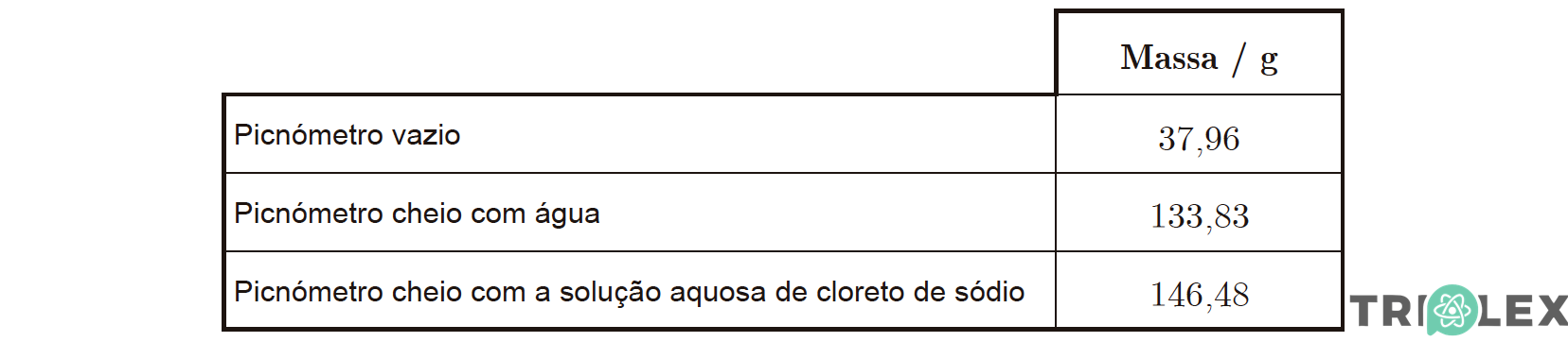 Calcule a densidade relativa da solução aquosa de cloreto de sódio.