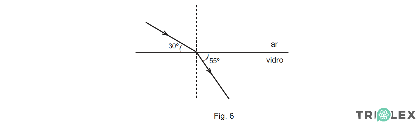 ⇒ O feixe refratado propaga-se no vidro, então, o ângulo de refração é igual a
