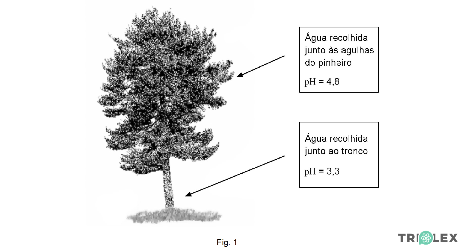 Como pH = – log [H3O+], quanto maior for o valor de pH, menor é a [H3O+]. De acordo com o indicado na figura, a água recolhida junto às agulhas do pinheiro apresenta um valor de pH de 4,8, superior ao da água recolhida junto ao tronco (3,3). Assim, a [H3O+] da água da chuva recolhida junto às agulhas do pinheiro é inferior à da recolhida junto ao tronco e, consequentemente, menos ácida.