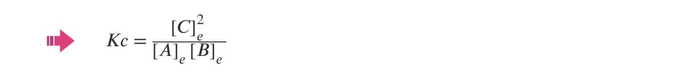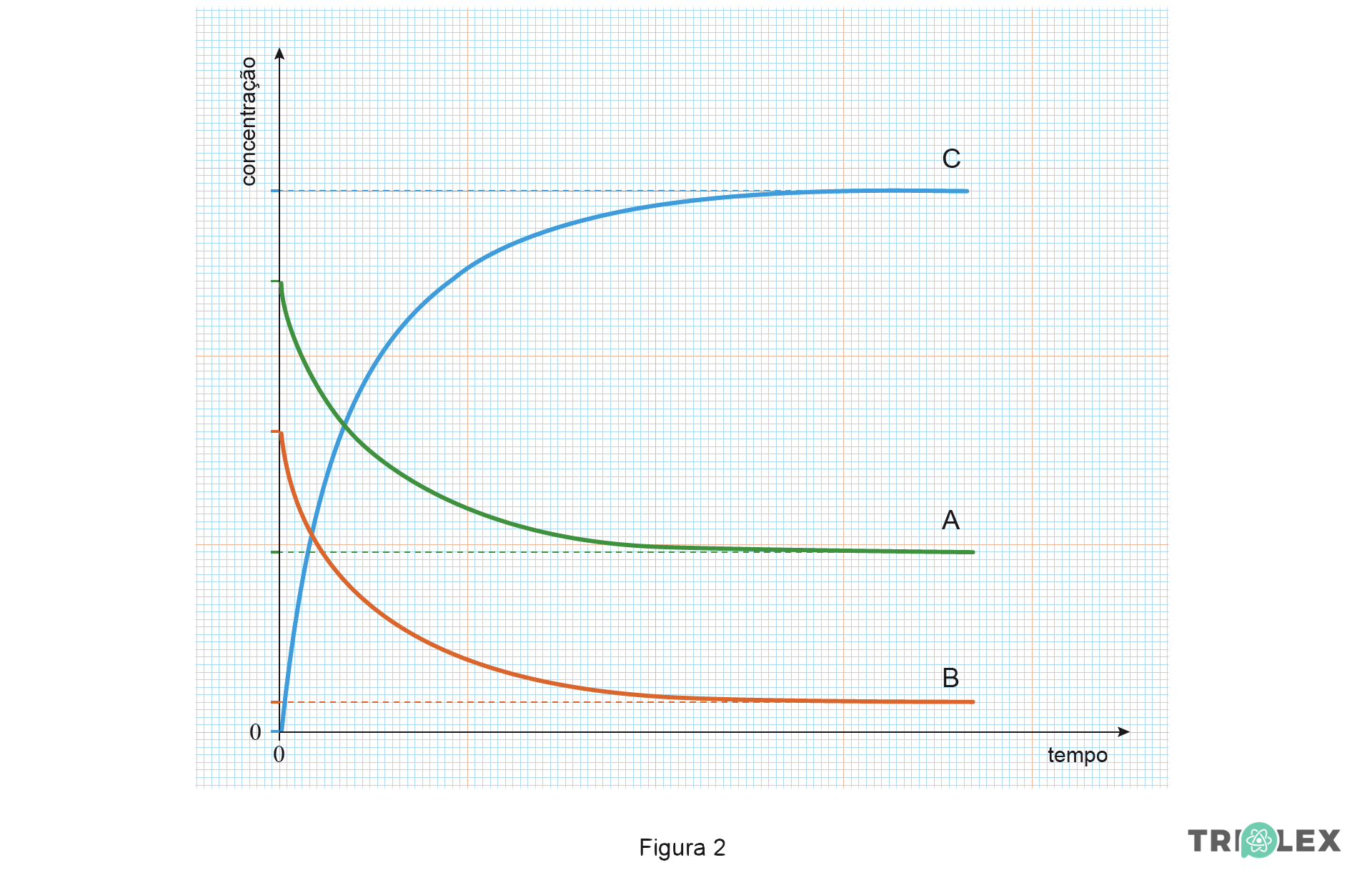 Em unidades arbitrárias, a concentração de C aumenta de 14,4 unidades e as concentrações de A e de B diminuem ambas de um valor correspondente a metade do aumento de C, 7,2 unidades; conclui-se que 1 mole de A reage com 1 mole de B, formando-se 2 moles de C (a estequiometria é 1 mole A : 1 mole B : 2 moles C) e a equação pode ser escrita como: A (g) + B (g) ⇋ 2 C (g)