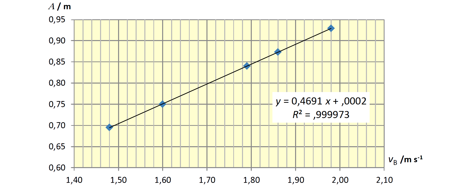- y = 0,4691 x + 2 x 10-4 ⇒ A = 0,4691 vB + 2 x 10-4 = 0,4691 vB (SI)