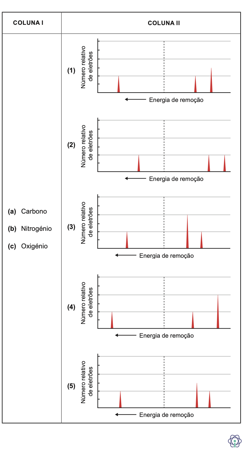 1.4. Associe cada um dos átomos, no estado fundamental, apresentados na Coluna I, ao esboço do espectro fotoeletrónico correspondente, apresentado na Coluna II.