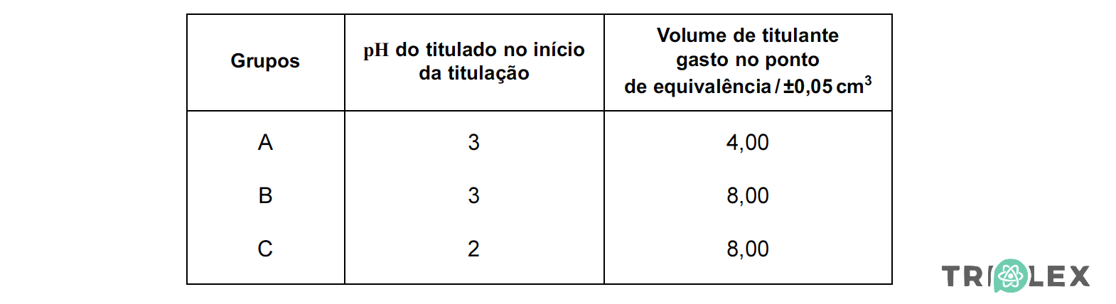 Como as concentrações das soluções tituladas pelos grupos B e C são diferentes (o pH do titulado no início da titulação é diferente) e o volume de titulante gasto no ponto de equivalência é o mesmo, os grupos B e C têm de ter titulado volumes diferentes de soluções ácidas.