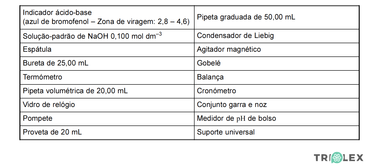 3.2. No laboratório dessa escola, existe uma lista de reagentes, material e equipamento disponíveis, a partir da qual outro grupo de alunos escolheu o que necessitou para realizar a titulação de uma solução aquosa de ácido clorídrico, HCl.