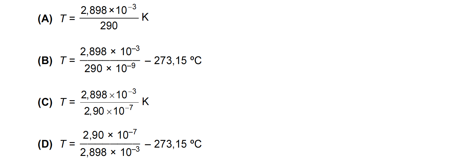 1.4.2*. Seleccione a alternativa que permite calcular, no Sistema Internacional, a temperatura da estrela, para a qual é máxima a potência irradiada, sabendo que essa temperatura corresponde a um comprimento de onda de 290 nm e que λT = 2,898 × 10–3 m K.