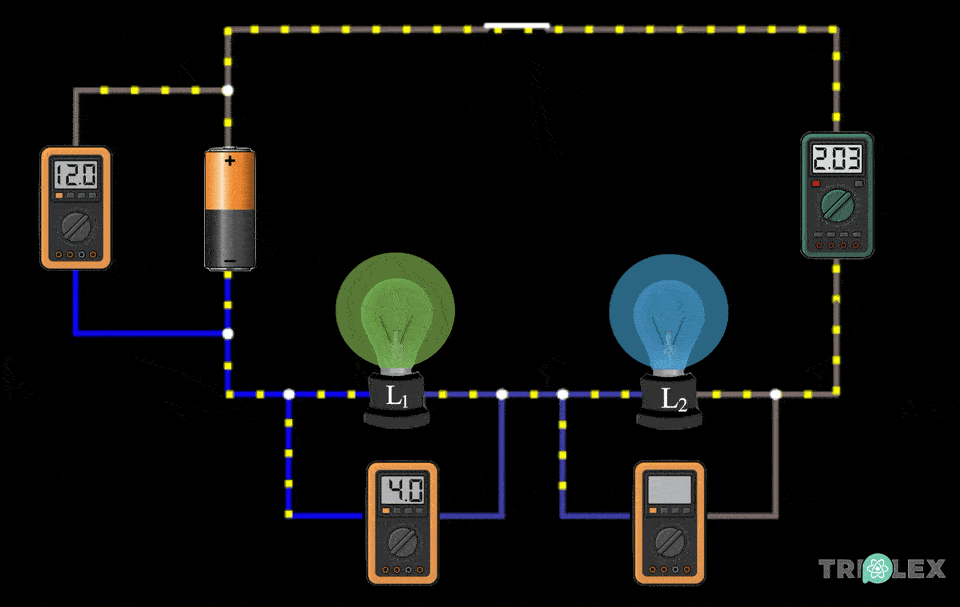 A resistência total do circuito das duas lâmpadas associadas em série é igual à soma das resistências das lâmpadas L1 e L2 associadas.