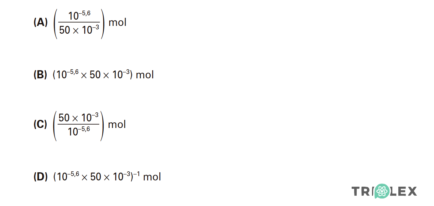 - n = c x v ⇔ n = 10-5,6 mol dm-3 x 50 x 10-3 dm3 ⇔ n = 10-5,6 x 50 x 10-3 mol