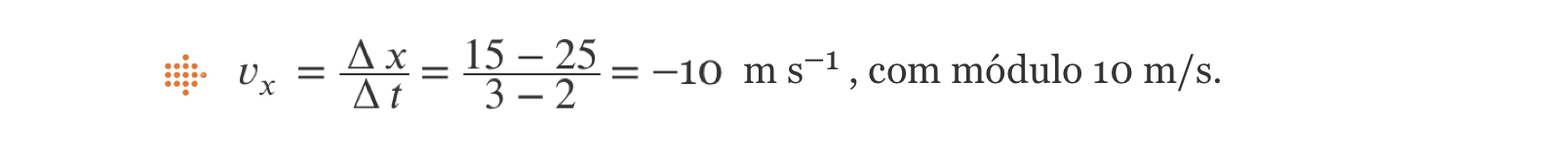 Identifica as posições final e inicial no intervalo [2,0 ; 3,0] s (xi = 25,0 m e xf = 15,0 m) e calcula o módulo da velocidade (v = 10 m s–1).
