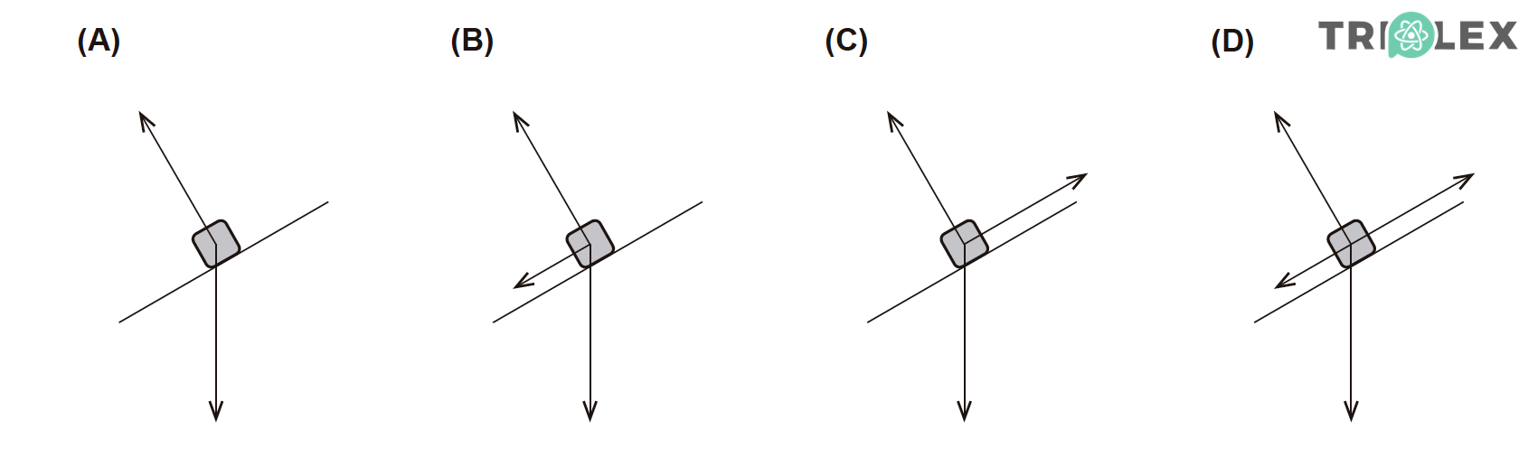 Qual dos diagramas pode representar, numa mesma escala, as forças que atuam no corpo, na subida da rampa, entre as posições B e C?