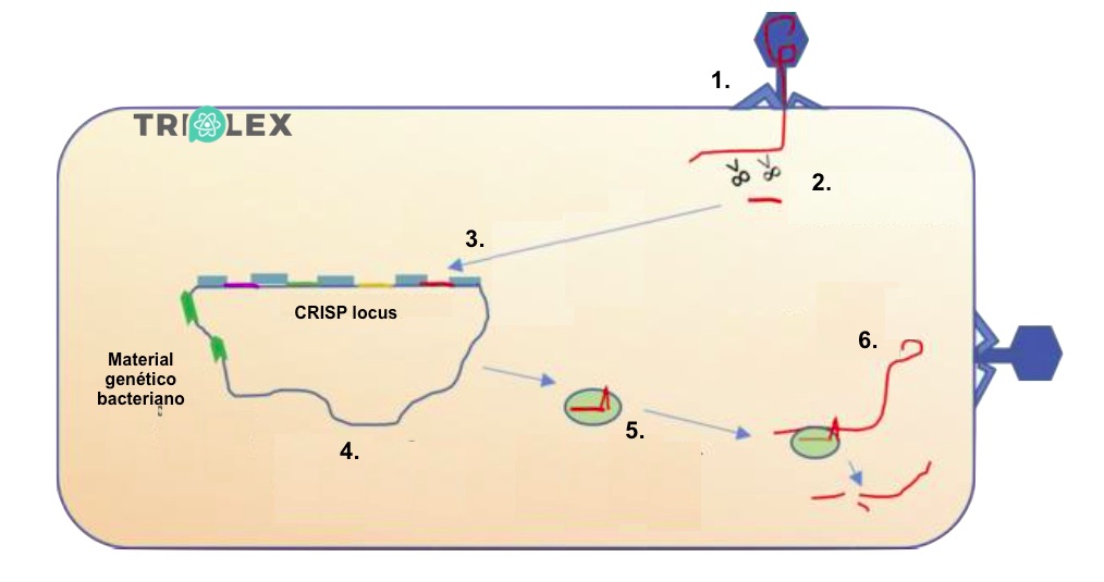 - Quando o material genético viral é incorporado no locus Crisp passa a fazer parte do material genético do seu hóspedeiro. Assim, como nas bactérias o processo de divisão celular coincide com o próprio processo de reprodução, sendo precedido pela replicação semiconservativa do DNA. Cada uma das células filhas formadas irá apresentar a mesma informação genética que a célula que as originou e portanto apresentará imunidade adquirida.