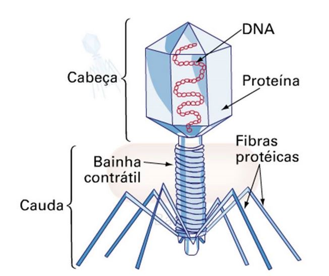 Existem vírus que parasitam bactérias – Bacteriófagos ou fagos. Um dos bacteriófagos mais estudados é o vírus T2, formado por uma cabeça de secção aproximadamente hexagonal que encerra uma molécula de DNA e uma cauda provida de fibras que fixam o vírus à bactéria infetada.