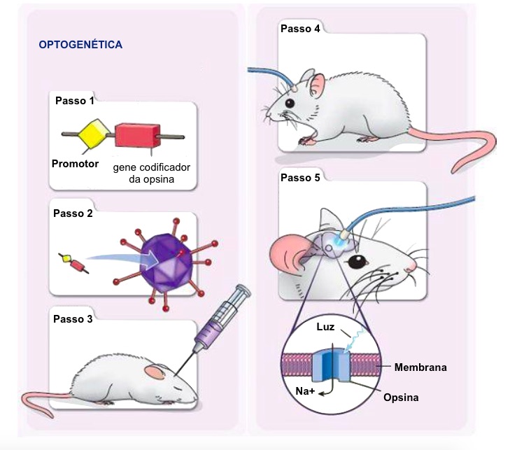Sem a necessidade de elétrodos, a optogenética implica um controle muito subtil dos mecanismos neuronais. Essa nova técnica envolve injetar em grupos selecionados de neurónios um vírus benigno contendo proteínas fotorreceptoras (chamadas opsinas) cujas informações genéticas vêm de algas fotossensíveis. Assim, as células neurais tornam-se sensíveis à luz. As proteínas, que atuam como interruptores, ligam ou desligam os neurónios de acordo com os flashes de luz enviados em milissegundos por cabos de fibra ótica. Esses feixes de luz podem estimular ou suprimir certos pensamentos e memórias.