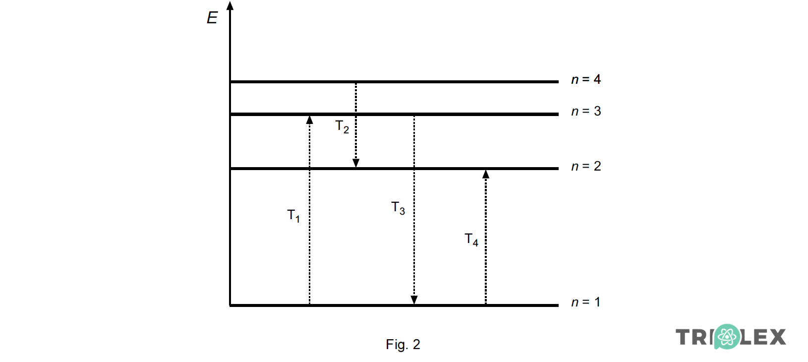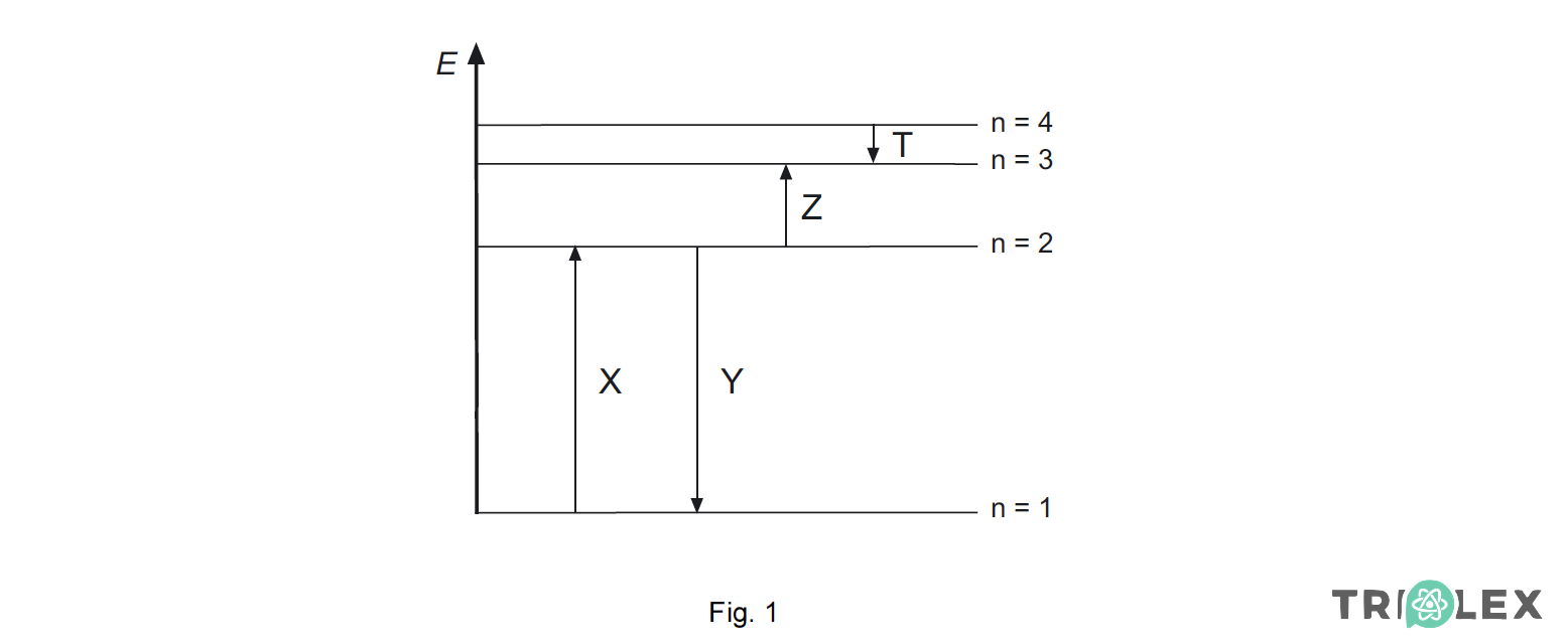Na figura 2 estão esquematizados alguns níveis de energia do átomo de hidrogénio (sendo n o número quântico principal correspondente a cada um desses níveis de energia), bem como algumas transições electrónicas, T1 a T4.