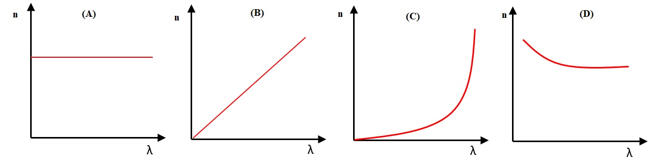 Seleciona o esboço do gráfico que pode traduzir a variação do valor do índice de refração, num vidro, em função do comprimento de onda de várias radiações monocromáticas na região da luz visível.