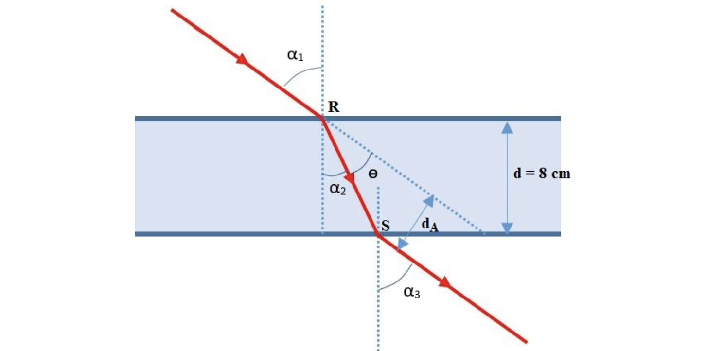 4. Um feixe laser incide numa lâmina de faces paralelas, de um material transparente (índice de refração, n), segundo um ângulo de incidência α1.