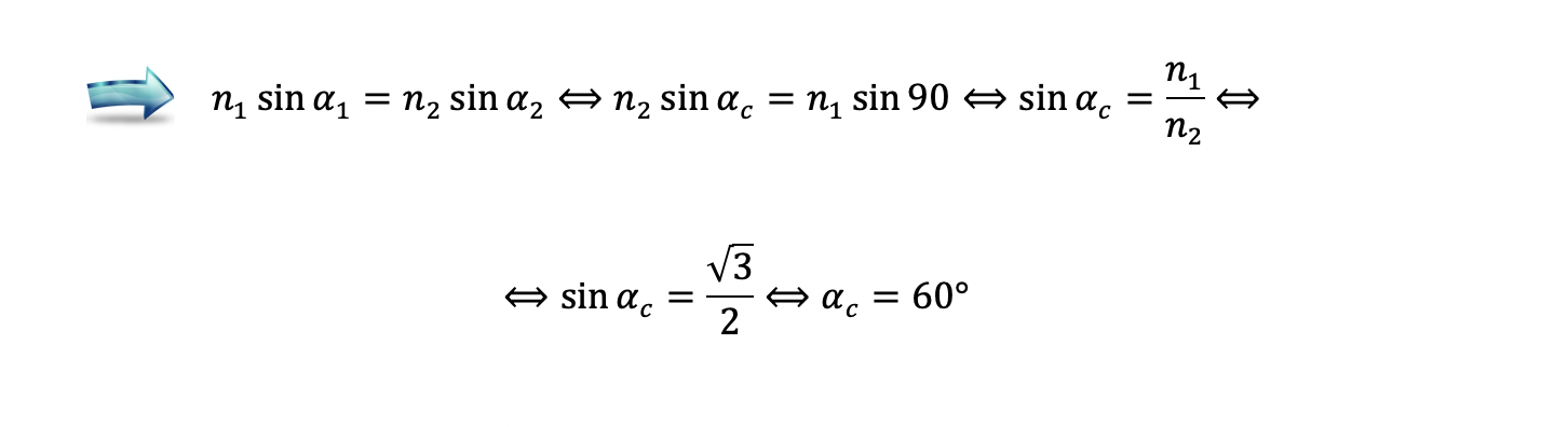⇒ Nesta situação em que a luz se propaga de um meio oticamente mais denso para um meio oticamente menos denso, temos de considerar a possibilidade de ocorrência da reflexão total da luz.