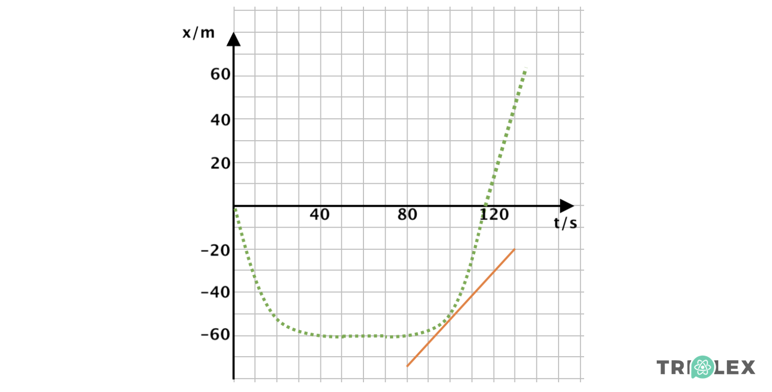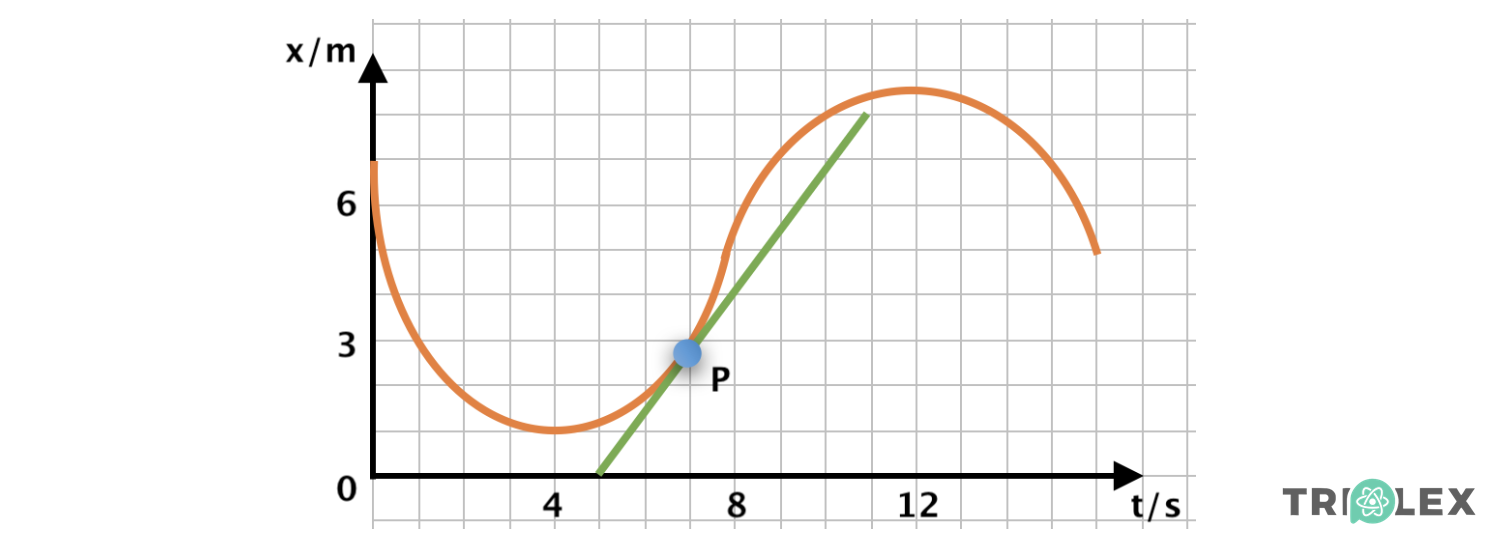 ⇒ A componente escalar da velocidade da partícula no instante t = 9,0 s é igual ao declive da reta tangente à curva, nesse instante. Considerando dois pontos dessa reta para determinar o declive, tem-se: