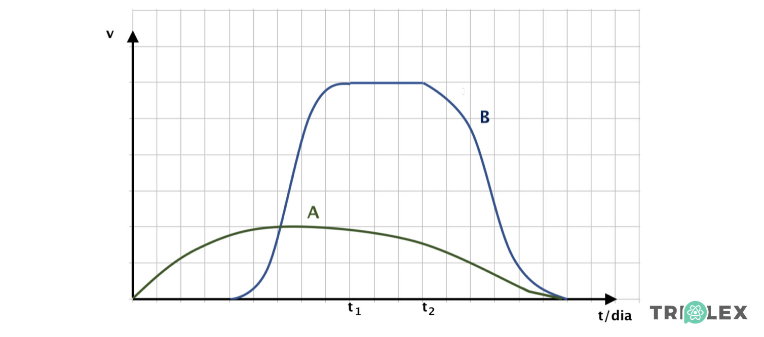 ⇒ Ao sombrear a área correspondente ao crescimento de cada uma das plantas, verifica-se que a área sob a curva B é maior do que a área sob a curva A, pelo que se conclui que a B registou um maior crescimento.