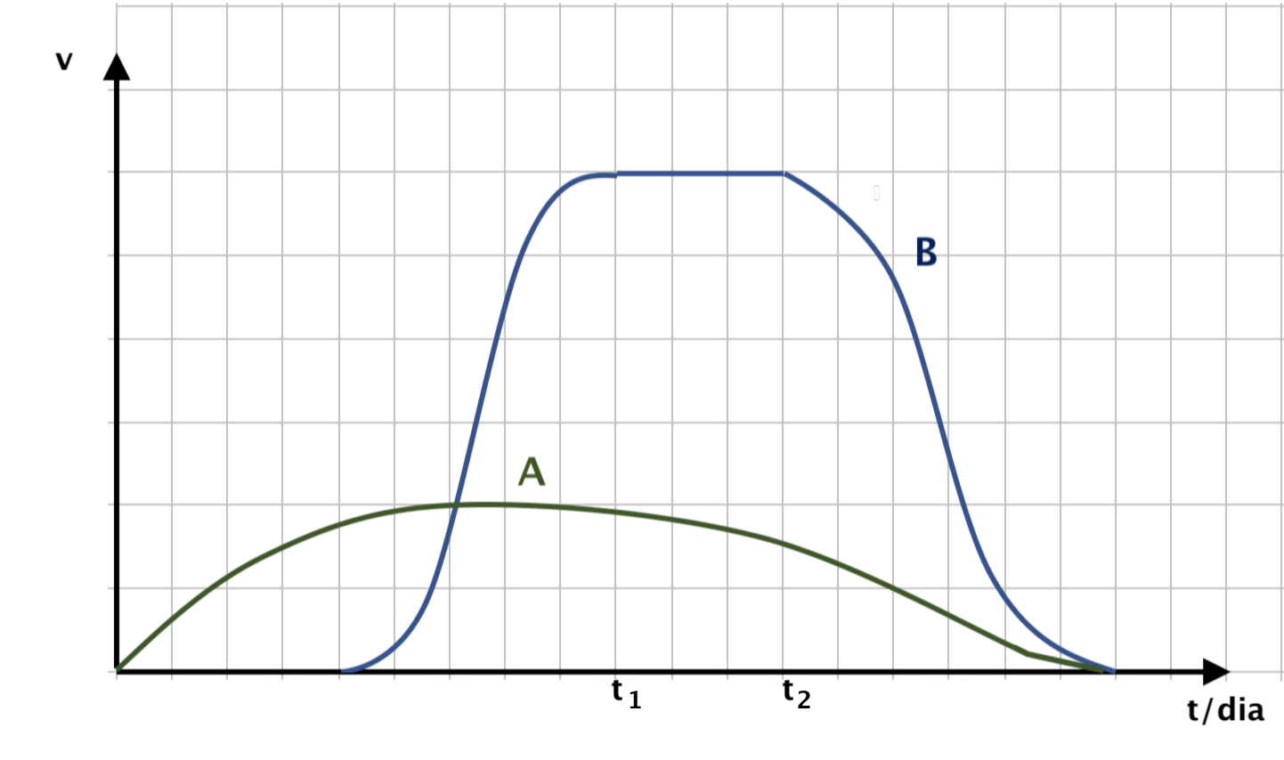 A, o crescimento de cada uma das plantas num dado intervalo de tempo é representado pela área subtendida ao gráfico. Ao sombrear a área correspondente ao crescimento de cada uma das plantas, verifica-se que a área sob a curva B é maior do que a área sob a curva A, pelo que se conclui que a B registou um maior crescimento.
