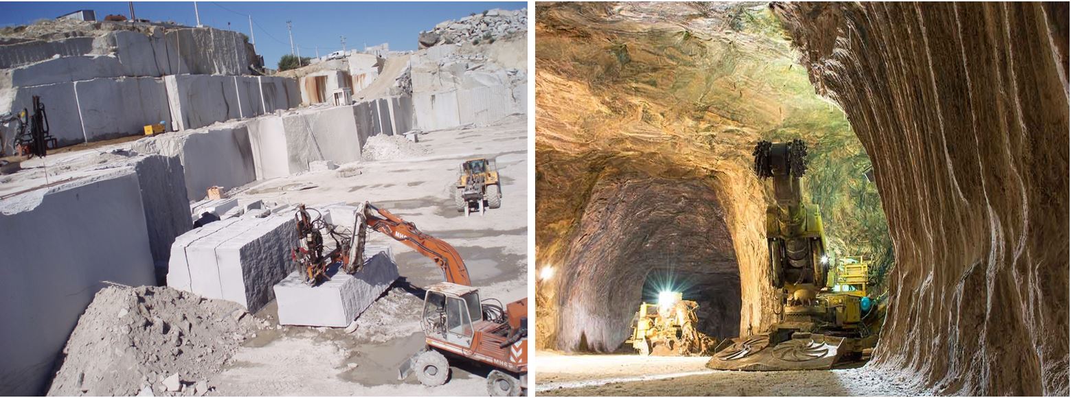 As pedreiras e as minas são locais de extração de rochas e minerais.